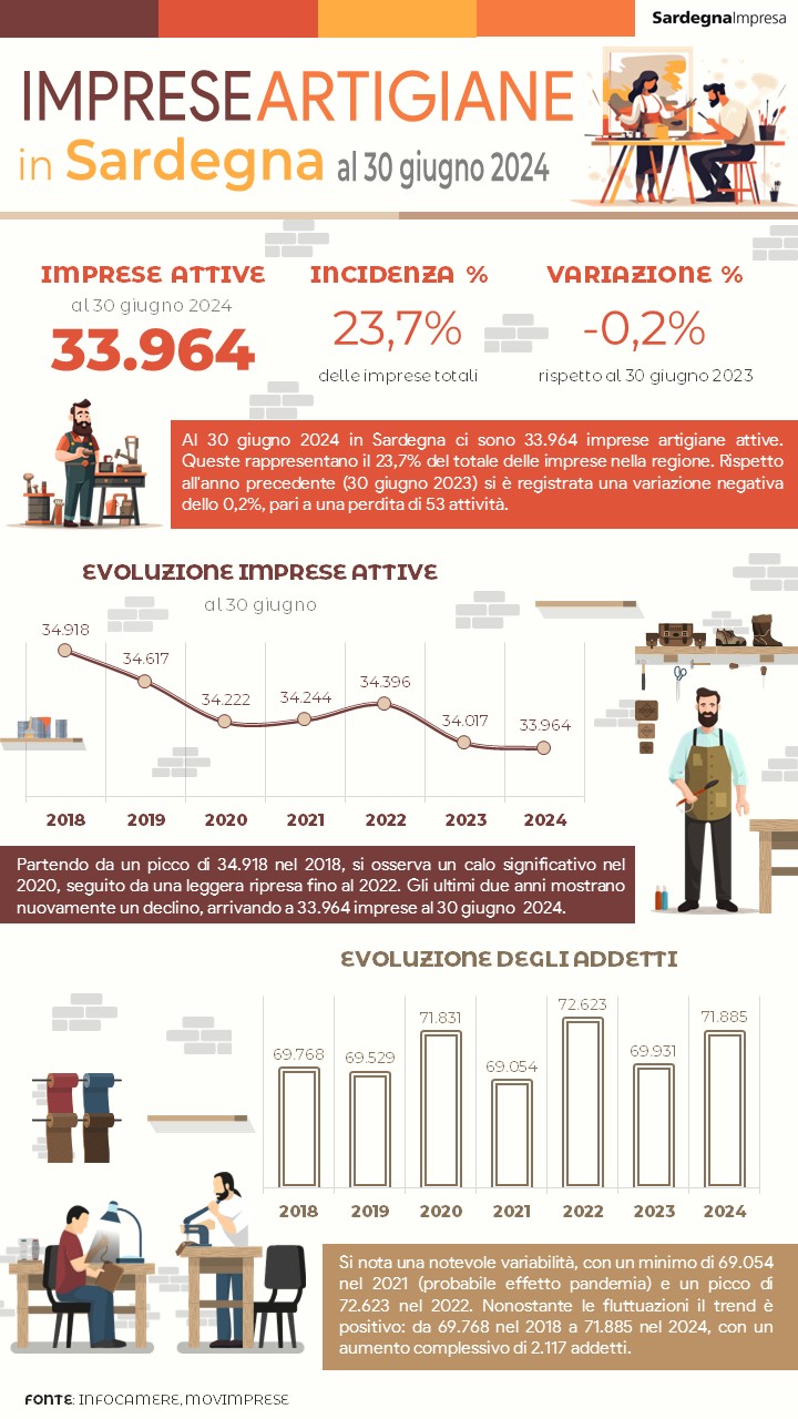 L’infografica sulle imprese artigiane in Sardegna ci offre uno spaccato interessante sul settore, rivelando sia segni di resistenza che alcune sfide da affrontare, con significative differenze tra le diverse aree dell'Isola.